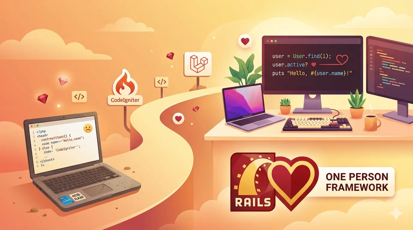 Perjalanan beralih dari PHP/Laravel ke Ruby on Rails dan alasan mengapa Rails menjadi framework pilihan dengan developer experience yang luar biasa, produktivitas tinggi, serta filosofi "one person...