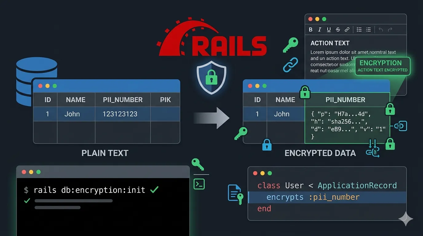 Active Record Encryption di Ruby on Rails memungkinkan enkripsi otomatis kolom database sensitif seperti nomor KTP dengan mengatur key di credentials dan menambahkan encrypts :column_name di model.