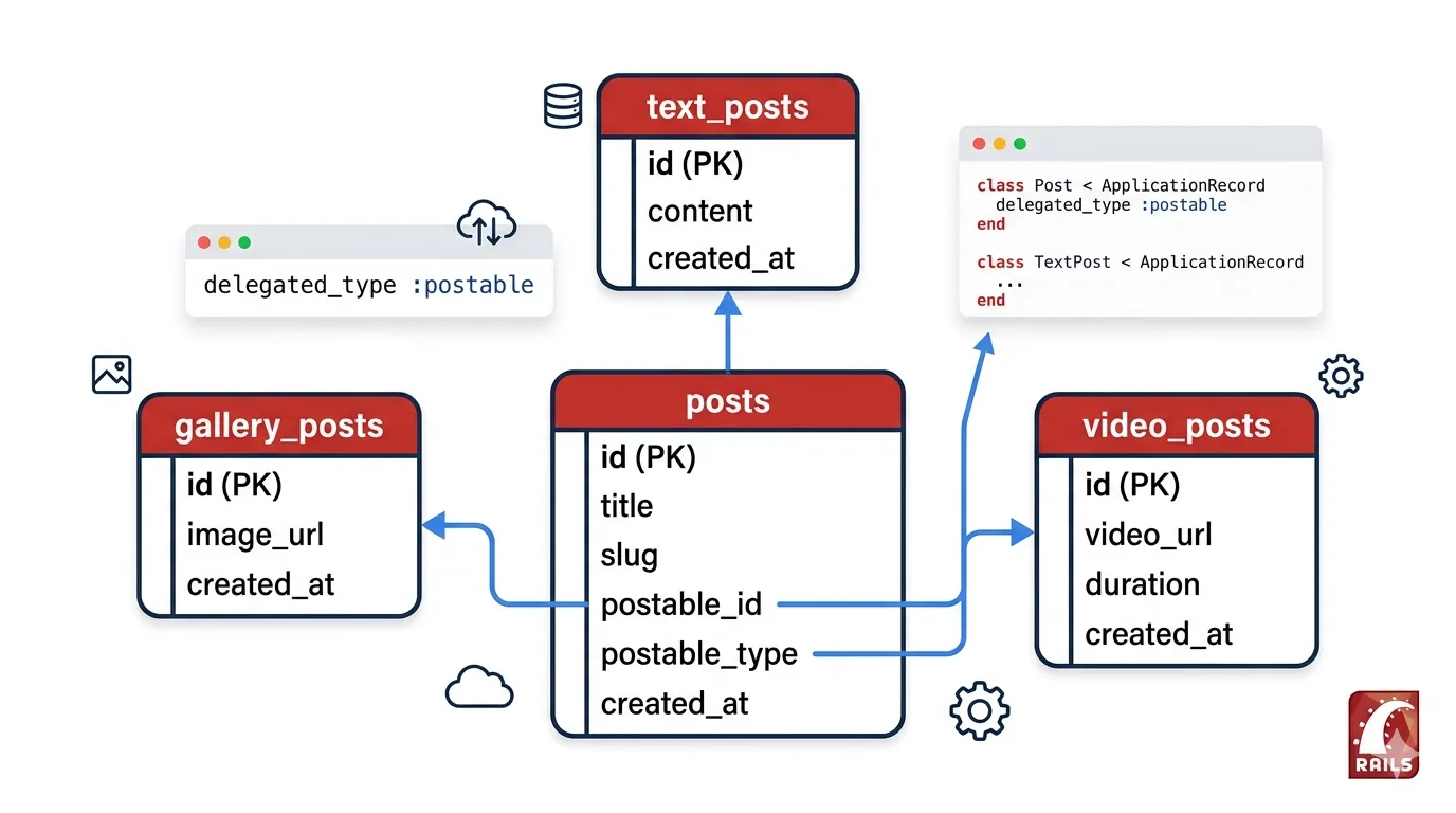 Active Record Delegated Type memungkinkan pengelolaan berbagai jenis post (Text, Video, Gallery) dalam satu tabel utama dengan atribut spesifik masing-masing disimpan di tabel terpisah melalui rela...