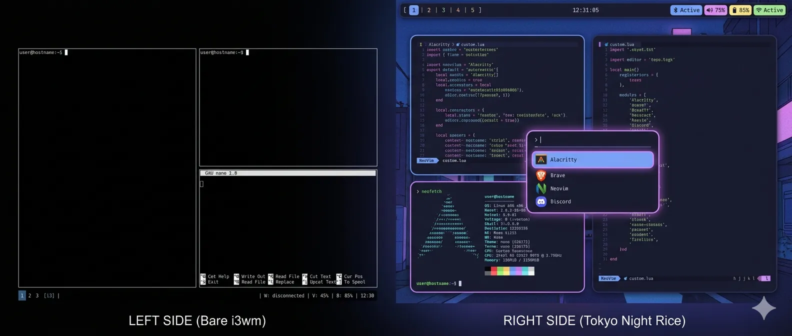 Penulis mengulas pengalaman migrasi dari Ubuntu MATE ke i3wm dengan komponen tambahan seperti picom, polybar, rofi, dunst, dan betterlockscreen untuk menciptakan tampilan desktop minimalist ala Oma...